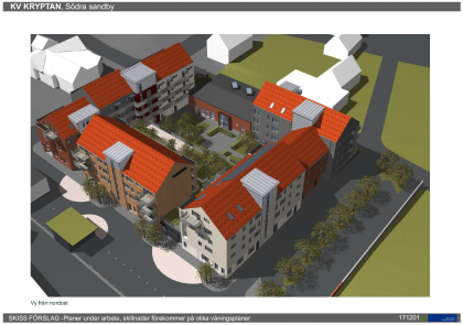 Kv Kryptan är Sandbys start på det nya centrum som skall byggas. 50 hyreslägenheter, 10 LSS-lägenheter, ett bibliotek, två butikslokaler och en vårdcentral! Litana Group valde utfackningsvägg...